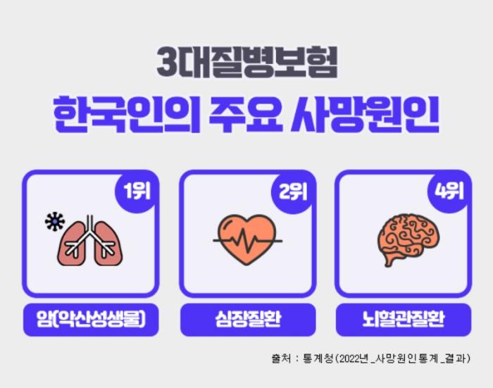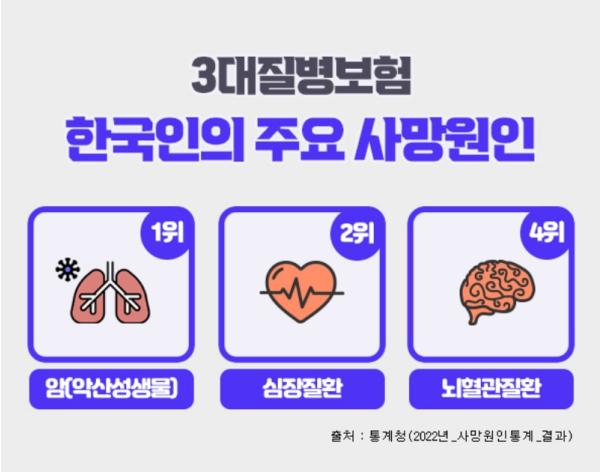 • 흔히 3대질병이라 일컫는 암, 심혈관질환, 뇌혈관질환은 통계청 발표자료에 따르면 한국인의 주요 사망원인 중에서 3위 폐렴을 제외하고 1~4위를 차지하고 있으며, 이전부터 지금까지도 살면서 가장 먼저 대비해야 하는 치명적인 질병으로 강조되고 있다. 이러한 중대질병에 대비하기 위하여 상기 세가지 치명적인 질병을 집중보장하는 3대질병진단비보험을 많이 가입하고 있다. 3대진단비보험은 각각의 질병을 중점적으로 보장하면서도 가입자 특성에 맞는 특약을 추가함으로써 종합건강보험으로도 활용할 수가 있다.