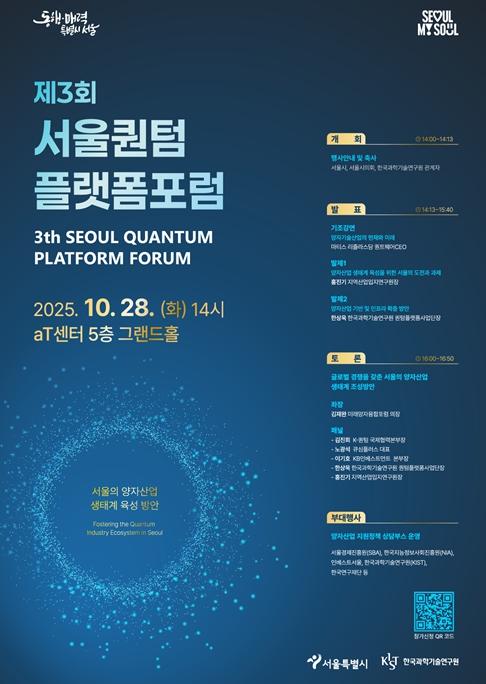 서울시는 한국과학기술연구원(KIST)과 함께 10월 28일 오후 2시, 양재 aT센터 5층 그랜드홀에서 ‘제3회 서울퀀텀플랫폼 포럼(3th Seoul Quantum Platform Forum)’을 개최한다고 밝혔다.