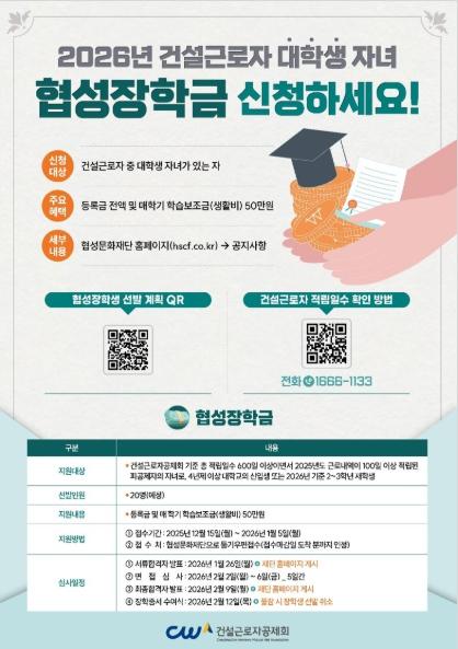 건설근로자공제회(이사장 직무대행 권혁태)와 협성문화재단(이사장 박석귀)은 건설근로자의 대학생 자녀 학업 지원을 위해 ‘2026년 신규 협성장학생’을 선발한다.