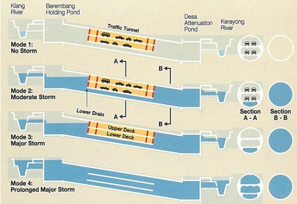 터널·저류지 등 전체 저류용량은 총 300만 톤에 달하며 강우 시 클랑강 홍수를 상부 저류지(Berembang Holding Pond)에서 터널로 흘려보내 저류하고, 비가 그치면 터널 하부 저류지(Desa Attenuation Pond)를 통해 케라용강에 방류한다.