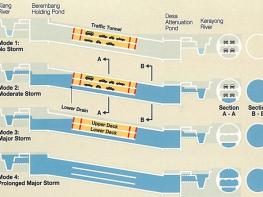 ‘SMART’는 총 4단계로 운영되는데 1단계에는 정상 운행하다가 2단계로 상향되면 도로는 정상 운영하되 하부 빗물 터널에만 물을 담기 시작한다. 3단계에 접어들면 차량 통행을 통제, 4단계가 되면 도로와 빗물 터널 전체를 수로로 활용한다.