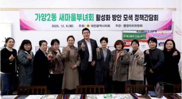 대전시의회는 9일 시의회 행정자치위원장실에서 ‘가양2동 새마을부녀회 활성화 방안 모색 정책간담회’를 열어, 향후 새마을부녀회의 활동 방향과 역할의 발전 방안을 논의했다.