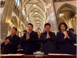 이재명 대통령과 김혜경 여사가 25일 서울 중구 명동대성당에서 열린 성탄 대축일 미사에서 기도를 하고 있다.
