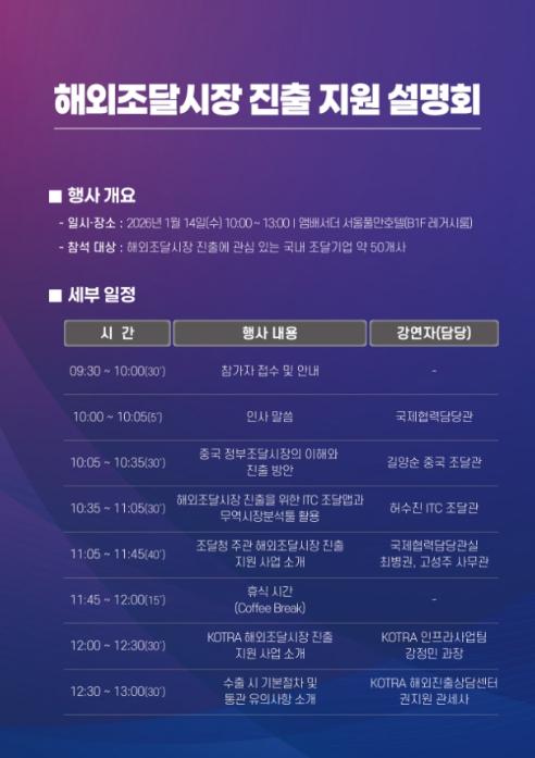 조달청은 14일 앰배서더 서울 풀만호텔에서 조달기업 60여 개사를 대상으로 해외조달관 초청 ‘해외조달시장 진출 지원사업 설명회’를 개최했다.