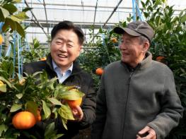오영훈 지사는 14일 오후 제주시 도련이동 만감류(레드향) 재배 농가를 방문해 수확 현장을 살펴보고, 농가와 농협, 만감류연합회, 수급관리센터 등 관계자들과 현장 간담회를 가졌다.