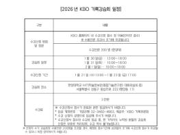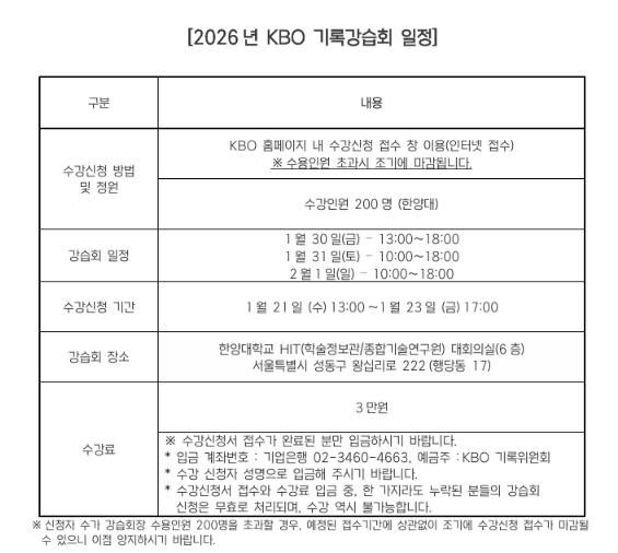 2026년 KBO 기록강습회가 1월 30일(금)부터 2월 1일(일)까지 서울 한양대학교에서 개최된다. 기록강습회는 야구 공식기록법의 보급과 이해를 통한 저변 확대를 목적으로 프로야구 원년인 1982년부터 개최됐다.
